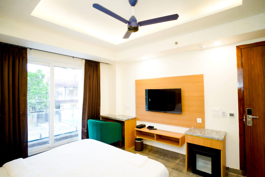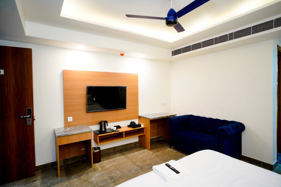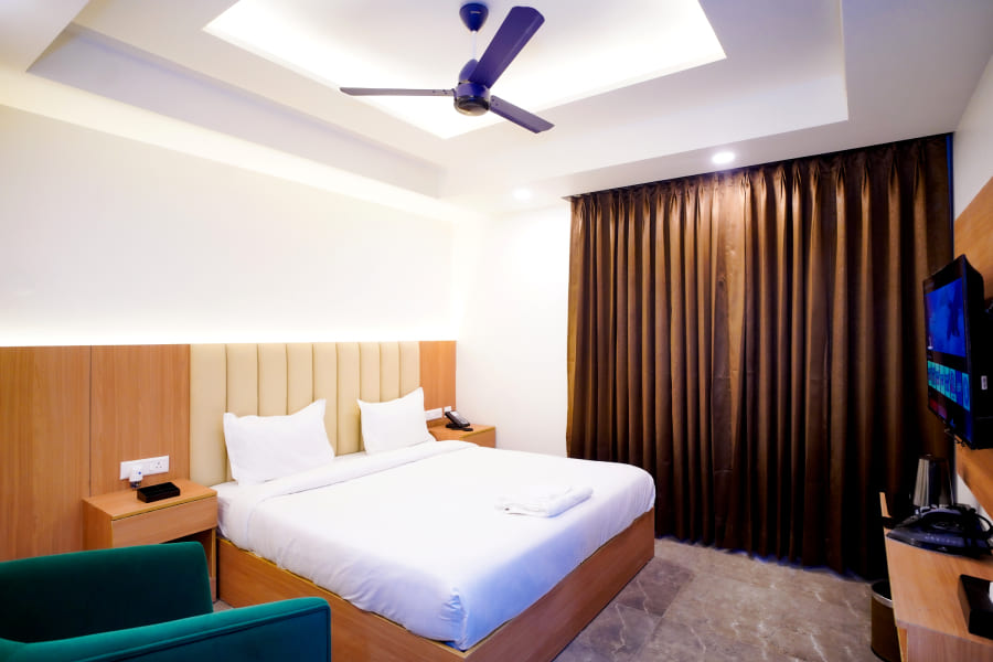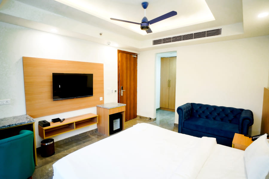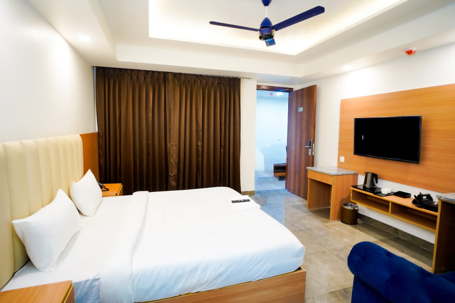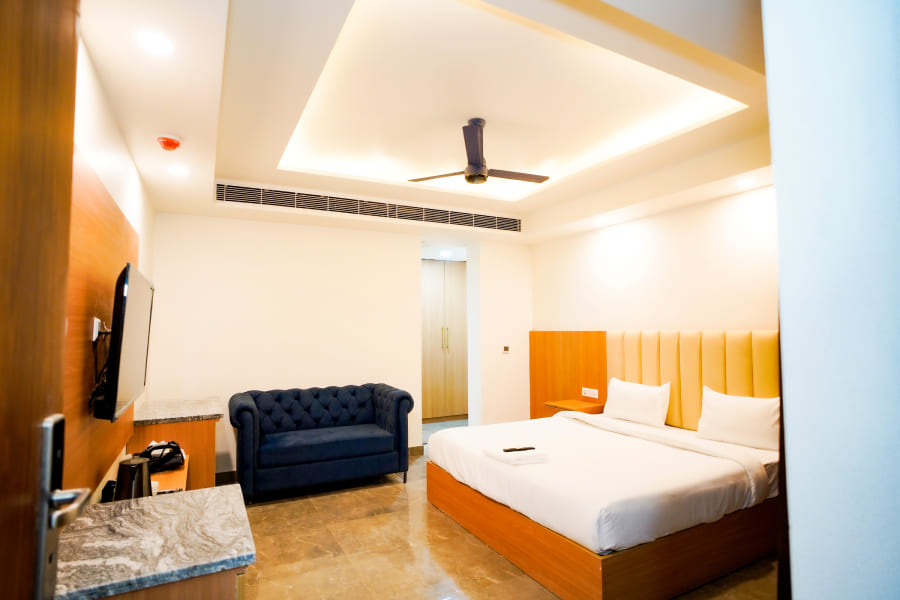 The Suite Room at Royal Raven Hotel & Banquet redefines luxury with its spacious design and elegant ambiance. Thoughtfully crafted for guests who appreciate comfort and sophistication, the suite features a beautifully furnished bedroom, a stylish living area, and modern amenities like high-speed Wi-Fi, a flat-screen TV, air conditioning, and a work desk. Every element is designed to offer a premium stay experience that blends functionality with elegance.